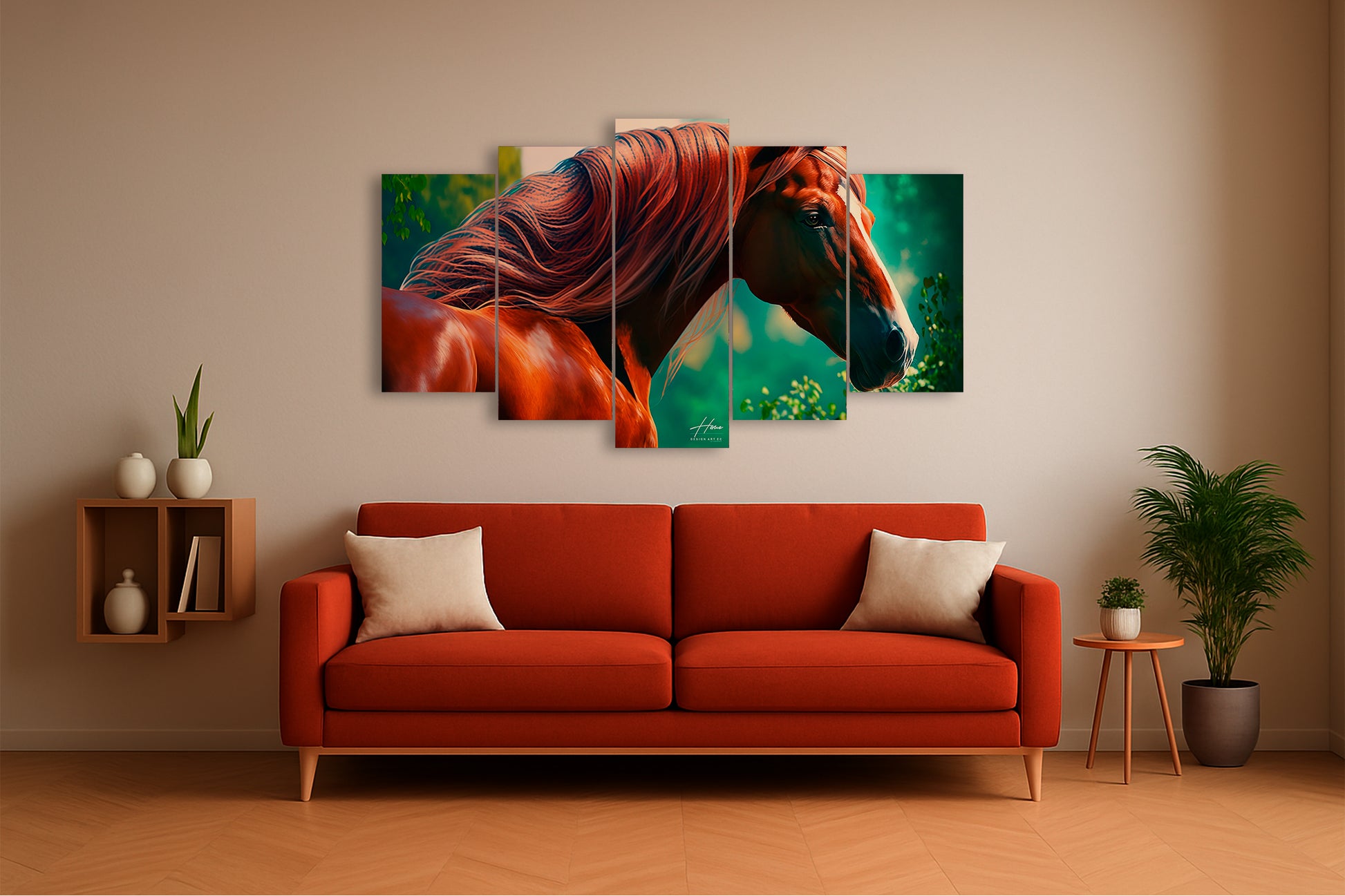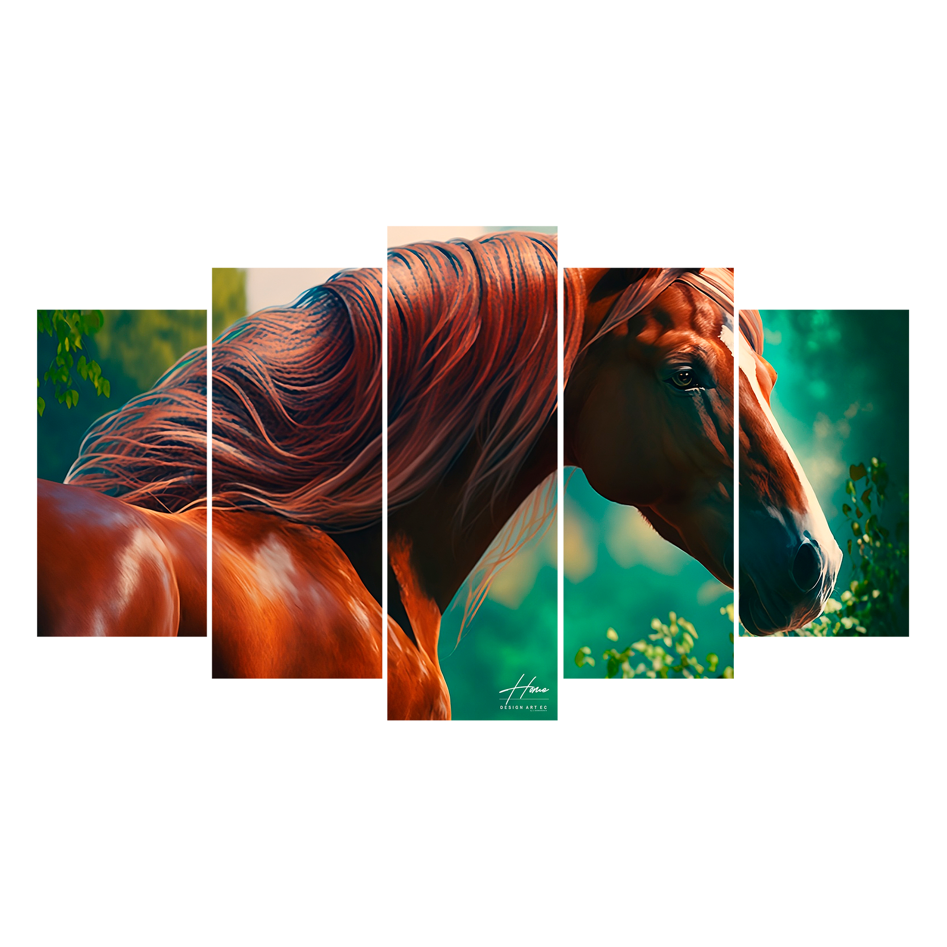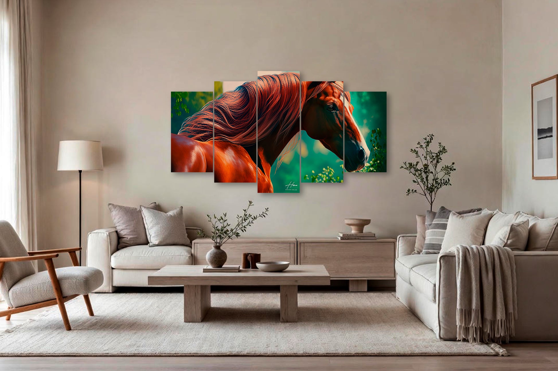🐴 Castaño Real muestra a un caballo castaño de porte sublime, iluminado por una luz suave que realza el brillo de su pelaje y la caída fluida de su melena. Su mirada tranquila y atenta transmite nobleza y fuerza serena, mientras el fondo verde difuminado crea un contraste que acentúa su belleza natural y su presencia imponente.