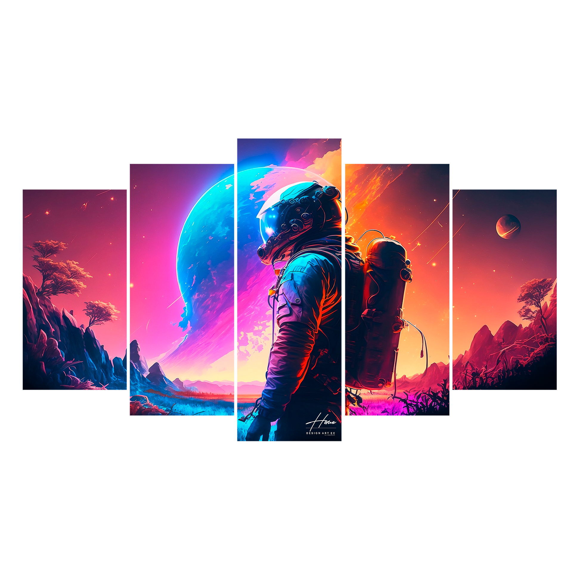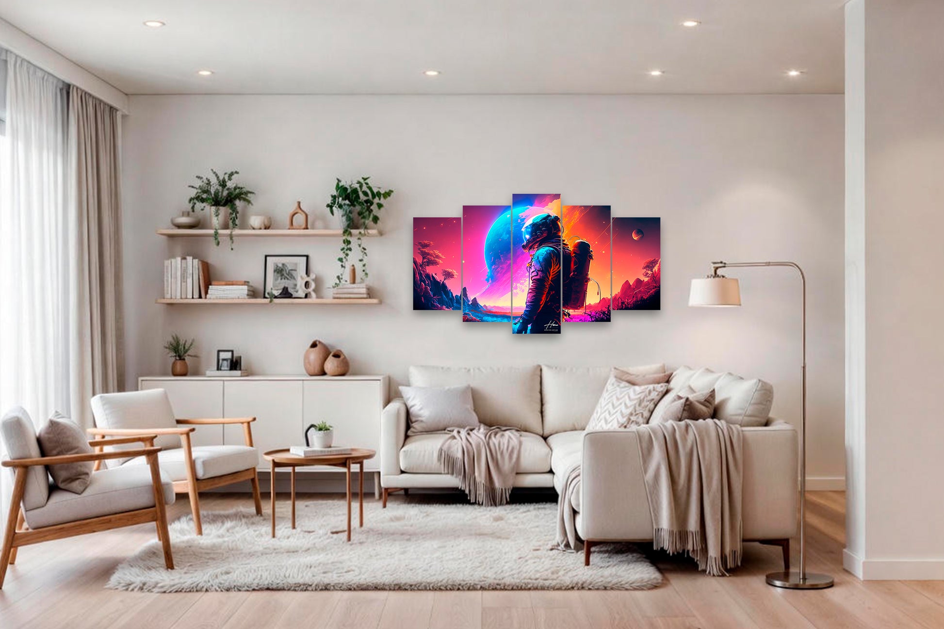 🚀El Último Explorador muestra a un astronauta solitario frente a un paisaje extraterrestre iluminado por tonos vibrantes de rosa, azul y naranja. Un enorme planeta luminoso domina el cielo, creando un contraste épico con las montañas oscuras y la vegetación surrealista del entorno. La escena transmite asombro, misterio y la sensación de estar ante un horizonte desconocido, donde lo cósmico y lo humano se encuentran en un instante de contemplación silenciosa.