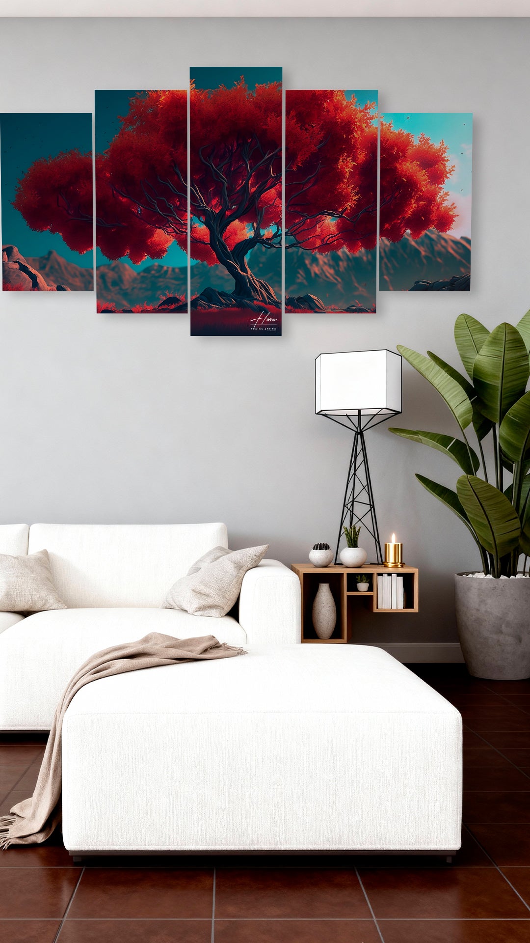 🍁Majestuoso Árbol con Follaje Rojo Intenso es una obra en la que las ramas retorcidas y elegantes se extienden hacia afuera como venas vivas que alcanzan el cielo.